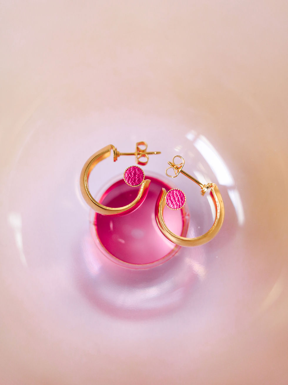 Paire de créoles dépareillées sur lesquelles sont incrustés des confettis de cuir d'agneau.